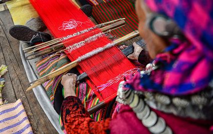 僜人俗稱“僜巴”,是一個生活在我國西藏邊境的族群,人口較少。僜人有自己獨特的語言,生活方式簡樸,起居穿戴有自己的習俗。僜人織品色彩艷麗,主色為紅色、粉紅色,由于沒有圖紙,每位織娘僅憑記憶織出腦海中的花紋,所以每一幅織品都獨一無二。