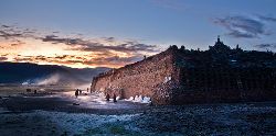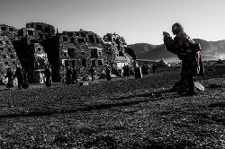 石經(jīng)城位于距石渠縣城呢呷鎮(zhèn)東北約90公里處的阿日扎鄉(xiāng)境內(nèi),坐落在雅礱江支流洛曲河西岸一處兩山相望的草原間,背靠一座平緩、渾圓的山丘,前面是一望無際的草原,由于草原極為遼闊,遠(yuǎn)遠(yuǎn)望去,整座城并不顯得特別雄偉、壯觀,但走近細(xì)看,這座用一塊塊刻滿經(jīng)文和佛像的石片、石塊在漫長歲月中逐漸壘砌起來的石城,所蘊(yùn)含的厚重與蒼茫,堅韌與神秘,讓我想起荷爾德林所說的“那些四處飄游的分散的力量,都匯聚在一個黃金般的中心”。