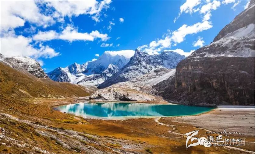 三神山中間的牛奶海,美麗的高原堰塞湖,面積0.5公頃,海拔4500米,四周雪山環繞,湖水清瑩碧藍,山上成瀑,以其玲瓏秀雅水色翠藍而著名,牛奶海上方有大片的冰川。傳說每年春暖花開之時,湖水會像牛奶一樣潔白如瓊漿,并因此得名牛奶海。