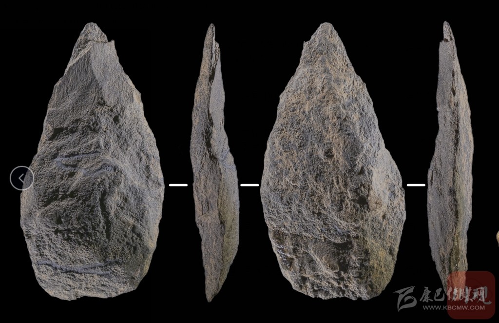 這塊有一端很尖的石頭,據說叫小型兩面器,看上去和手斧有點像,但比手斧小很多,目前在國內舊石器時代尚屬首次發現。原來,它就是從石塊上打下的石片經過加工后而成。它的邊緣頗為鋒利,端部尖銳,同樣具有切割、鉆孔等多種功能。